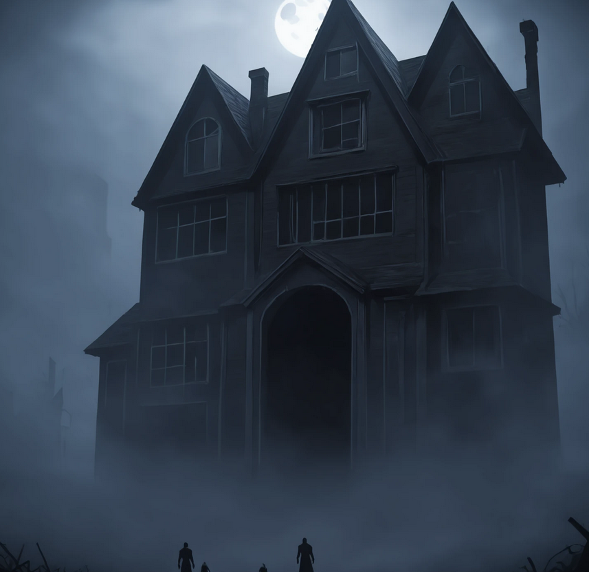 - プロンプト:dark atmosphere, haunted house, ghostly figure, fog, cinematic lighting