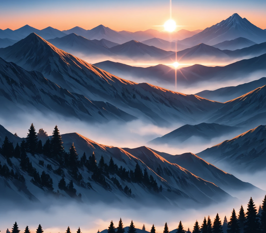 - プロンプト:ultra realistic, high resolution, mountain landscape, sunrise, misty forest