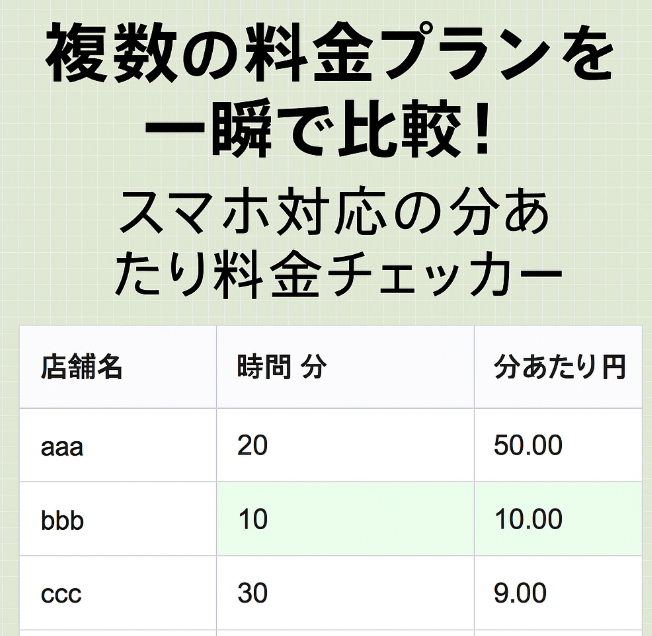 時間と料金を入力するだけで、1分あたりの金額を自動計算し、最も安いプランを淡い緑色でわかりやすく表示します。