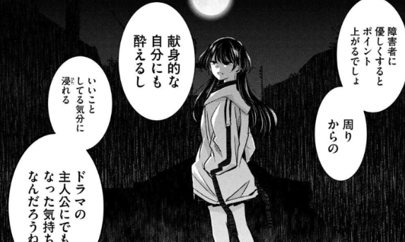 凛音と咲希がやりとりする場面は、雨夜の月2巻の中でも特に緊張感が強いシーンです。咲希に対して放った言葉は非常に辛らつで、障害を持つ姉を利用しているように見える、献身的な自分に酔っている、そういうタイプが一番うざいなど、表面だけを取れば攻撃そのものです。しかし、この言い方の裏にある感情は単純な敵意ではなく、むしろ強い警戒心と姉を守ろうとする焦りの混ざったもののように見えました。