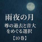 タイトルとして使われてきた雨夜の月が、物語の中の会話として改めて登場したことで、作品全体を振り返る視点が生まれる場面でもありました。
