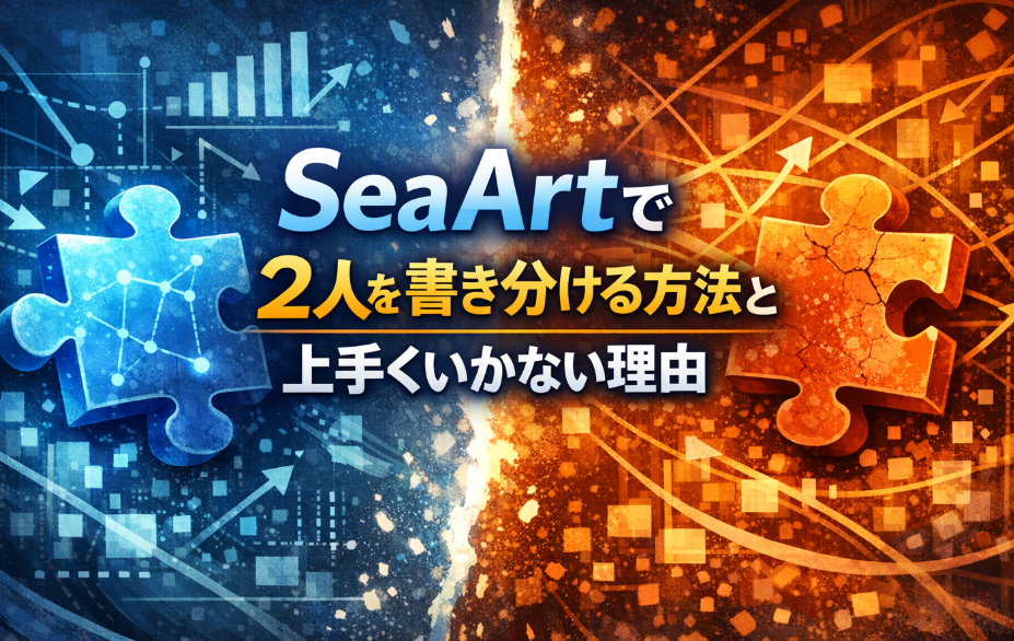 本記事では、SeaArtで2人を出すための基本的な考え方から、よく使われる人数指定プロンプト、構文を分けるための工夫、そしてなぜ細かい書き分けが難しいのかという背景までを順番に整理していきます。