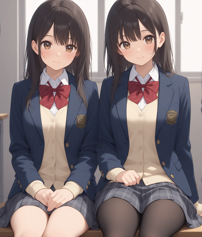 これらのプロンプトは、人物が複数存在するという前提をモデルに伝える役割を持っています。そのため、髪型や服装を細かく分ける効果はほとんどありません。例えば twins を使っても、必ずしも左右で同じ服装になるとは限らず、あくまで双子という概念が全体に反映されるだけです。