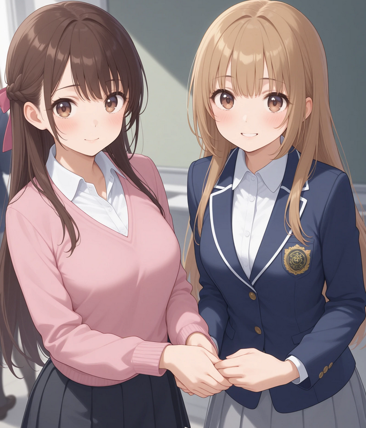 複数人用LoRAが得意なのは、画面内に複数の人物が自然に収まる構図を作ることです。人物同士の距離感や配置が破綻しにくくなるため、2人が並んで立っている、向かい合っているといったシーンは作りやすくなります。一方で、髪型や服装を人物ごとに厳密に分ける力はあまり強くありません。