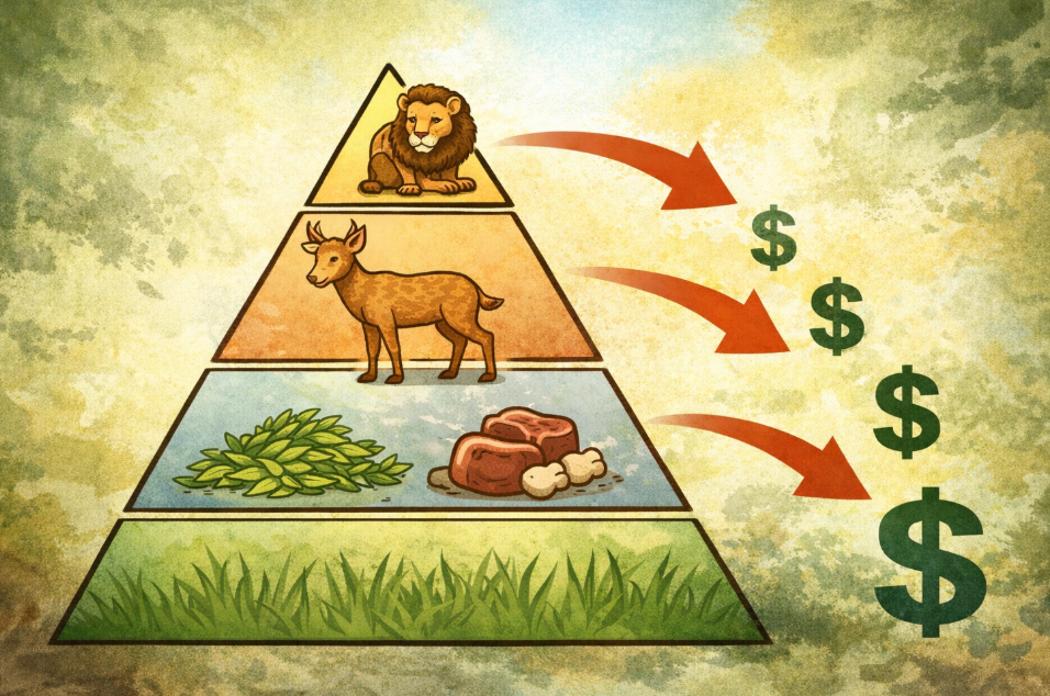 肉食動物を食べない理由を考えるうえで、まず知っておきたいのが10%の法則です。これは食物連鎖において、ある生物が摂取したエネルギーのうち、次の段階へ移行するのはおよそ10%程度に過ぎないという考え方です。