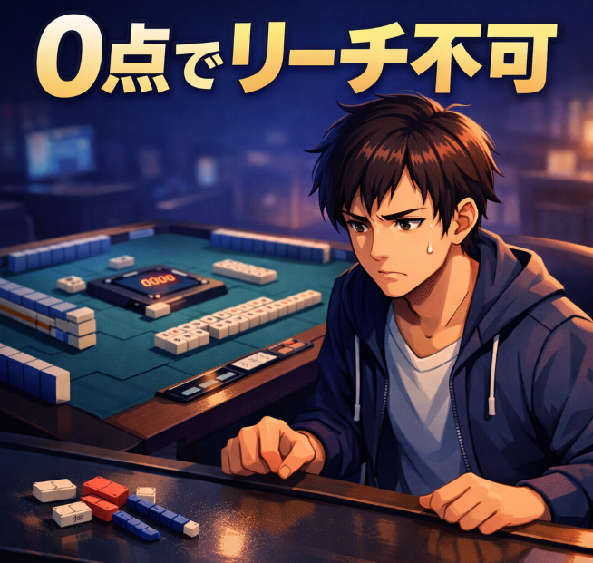 対局中に迷いやすい部分ですが、リーチ条件と飛び条件を分けて理解しておけば混乱しにくくなります。0点でまだ局が続いていても、リーチはできない。この点を押さえておけば十分です。